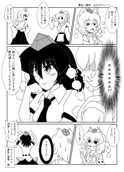 今回は前回のコミトレから1カ月といことで、しっかりと新刊を落とし(!?)前回のコピー本とペーパーのみの持参となりました。 ( ´△`)アァ- せっかくの紅楼夢なのに… まあまあ自分の不甲斐なさを書くのも飽きたのでw ざっと感想を書きなぐっておきましょう。 今回の右隣りさん「蝶番の玩具箱」様 新刊を頂きまして、ありがとうございます。 今回は未完成ということですが、ドントマインド! オイラはいつも未完(ry すみません、すぐ自虐に走るのは人間の器が小さいからですw 完成版の本、楽しみにしております。 また、どうやらウチの本を持っているとのことで、ありがとうございます<(_ _)> 今後ともどうぞ宜しくお願い致します。 今回の左隣りさん「猫が九匹!」様 こちらも新刊を頂きまして、ありがとうございます。 お話をお伺いしたところ、同人作家として非常に歴のある大先輩であり、マンガの技法からストーリーの構想、果ては風の個人的な悩みまで聞いて頂きました(ヲイヲイ… 手元にご依頼されたスケブを3~4冊描かれている最中にw はい、すごいオイラ邪魔してますね・・・(;´Д`)ウウッ… そんな私にも色々なことを教えて頂き、本当にありがとうございました。 さて、今回は相方不在の為、スペースから一歩も動けず、おまけに寝不足があいまって、色々な方にご挨拶に伺うことができませんでした。 申し訳ございません。 今度からもう少し旨く立ちまわれるように準備と予定を組んでいきます。 そんな私にわざわざご挨拶に来て下さいましたk2さん、NONEさん、鬼 畢无さん、郵便天使さん、ありがとうございました。 あと、寝ぼけながらも「猫が九匹!」さんとの会話に熱中していた為に、どうも以前イベントでご一緒させて頂いた作家さんを数名スルーしたような気がしなくもない…。 最悪だな俺…orz もし無視された、シカトされたなどという作家さんがおられましたらすべて風というヘタレの責任です。 申し訳ございません(ノД`)シクシク あ、最悪ついでにもう一つ。 今回カタログ買ってなくって、当日会場で購入したもんだから全然位置関係とか近所に誰がいるかとか把握しておりませんでした。 んで、なんと2席隣に以前合同誌「東方妄想伝」でご一緒させて頂きました桐生 悠さんのスペースががが!? 鬼 畢无さんに教えて頂かなければ華麗にスルーするところでした(・・;) もうひとつ課題だ、2つ3つ先の周りにも気を配りましょう! 以上、結局反省点と自虐だらけのイベントレポでしたw すげえ…ブログ書かなさ過ぎだろ…