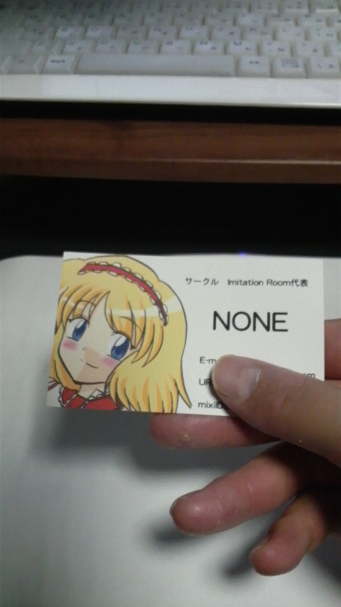 コミコミ13参加された皆さんお疲れ様でした~ 今回、東方じゃないジャンルで初参加だったんですが 買ってくださった方、わざわざ挨拶にきてくれた方、皆さんありがとうございました。 さて戦利品はぼちぼち楽しむとしてw 今回一押しのお宝GETだぜ Garanさんとこでめるブイさんにお会いしましていただきました こ、これが紅楼夢で伝説と化した あの早苗さんGUNKATA.Ver… ふはは ついに生早苗さんをGET 描きあがったばかりのものを 快くくださっためるブイさんに感謝<(_ _)> そしてコミコミ後の打ち上げ東方酒宴郷にてお会いしました ノゼさん(名刺にはNONEさんとありますね)に頂きました名刺! なんという可愛らしい名刺! まさかお会いできてお話できるとは思わず 緊張のあまり何話したかあんま覚えてない(←アホ わざわざ携帯で話しに出た既刊の絵を紹介してくださったり 東方界隈の同人作家さんはイイ人いっぱいです…( ´Д⊂ヽ 本当にありがとうございました さっそくお宝を飾るw 使用前 ↓ 使用後 ヒャッハーなんてお宝だ! 某トレジャーハンターが見たらきっとこう言うぜ それはそうと今回東方本でもなんでもないのに 無理やり参加させていただいた打ち上げ東方酒宴郷 なんか徹夜明けにあのテンションすごくて おじさんあんまり後半の記憶がありませんw シラフだったのにw だが私は謝らない(ぉ 東方酒宴郷企画&参加された皆様もお疲れ様でした!